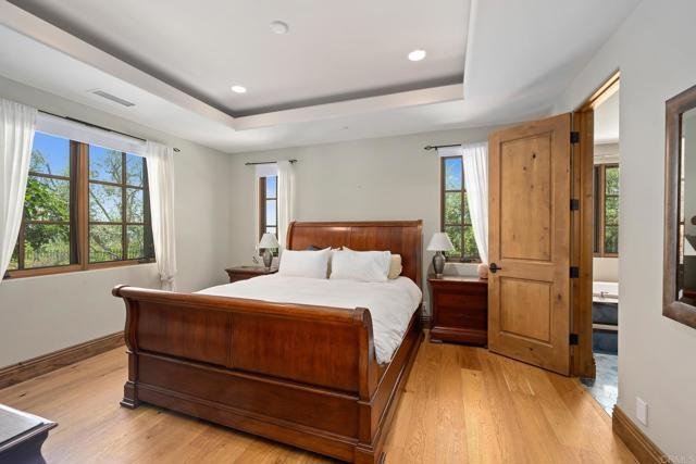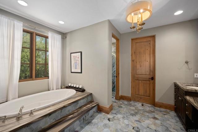 Welcome to the pinnacle of luxury living in Santaluz, nestled on nearly 3 acres of resort-style grounds. This magnificent estate encompasses 12,826 square feet of elegance and sophistication. As you approach the gated entrance, you’re welcomed by impeccably landscaped grounds and breathtaking west-facing panoramic views of the Santaluz golf course, mountains, and ocean. Step inside, and the interior unfolds seamlessly with classic and contemporary design elements. High ceilings, large windows, and open-concept spaces create an airy, light-filled environment. The heart of the home is a gourmet kitchen equipped with top-of-the-line appliances, a large center island, custom cabinetry, and a large butler’s pantry. Adjacent to the kitchen is an elegant dining room and great room that opens to the outdoor living spaces, allowing for effortless indoor-outdoor entertaining. Step outside to a backyard oasis. The home backs to the prestigious Santaluz golf course and sits majestically on Hole 1. You will also find a vanishing edge swimming pool that seemingly merges with the horizon, offering breathtaking sunset views. The expansive patios and covered loggias provide multiple settings for relaxation or hosting large gatherings. A BBQ area with a fully equipped outdoor kitchen invites you to enjoy alfresco dining. There’s a putting green for golf enthusiasts, a batting cage for sports lovers, and multiple lounging areas to soak in the serene ambiance. The main residence lives like a single-story home, featuring five large bedrooms, each with an ensuite bathroom, offering comfort and privacy for family and guests. The primary suite boasts a spacious bedroom with a sitting area, a spa-like bathroom with a soaking tub, a walk-in shower, dual vanities, and a custom walk-in closet. For fitness enthusiasts, a dedicated gym allows for daily workouts without leaving the comfort of home. See Supplement for more details. The downstairs bonus room offers additional flexible space, with four secondary bedrooms set off this main room. It is perfect for a playroom, art studio, or game room. Also downstairs is a large office with built-ins and a fireplace, wine cellar, two laundry rooms, and a music room. A 7-car garage is ideal for car enthusiasts! The home’s upper level opens to a large bonus room, an entertainer’s dream, featuring a full bar and a state-of-the-art movie theatre room designed by Digital Concierge. This theatre provides an immersive cinematic experience with plush seating and cutting-edge audio-visual technology, ideal for movie nights or hosting the ultimate watch party. The property also includes a one-bedroom, one-bathroom casita, ideal for extended stays for family, guests, or live-in staff. This private guest house is thoughtfully designed with its own living area, ensuring comfort and independence. This estate is more than just a home; it’s a lifestyle destination, offering unparalleled luxury, privacy, and convenience. The energy-efficient home has owned solar. With its prime location on the Santaluz golf course, resort-style amenities, and exquisite design, this property truly represents the pinnacle of Southern California living.