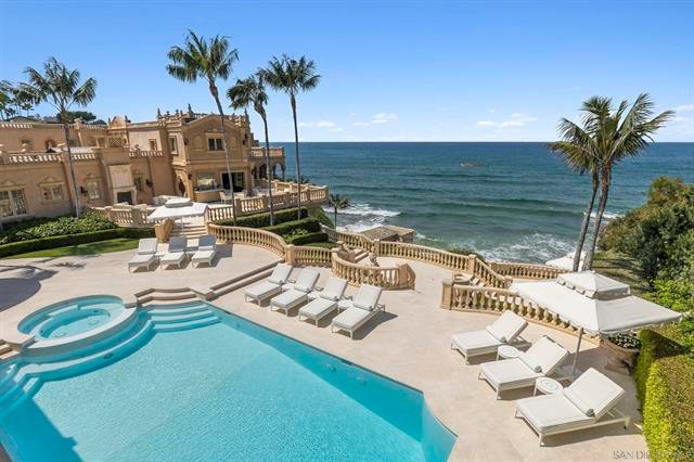 The Sand Castle is La Jolla’s most iconic waterfront jewel and includes one of the only on-property private beaches in California. A stunning homage to the finest manors on the French Riviera, the inspired and meticulous elegance of the Main House, Guest Residence and expansive grounds provides magnificent living while honoring extraordinary unobstructed views of the Pacific and coastline to the west, north and south. European and bespoke interiors and exteriors perfectly meld with modern conveniences, deftly designed and curated by global interior design icon, Timothy Corrigan. A tone-on-tone palette mirrors the sea and sky while continually orienting the visitor towards the home’s dramatic ocean views. No expense was spared in creating The Sand Castle. Multistory, manicured hedges cocoon the property, and upon entry through the magical courtyard and grand front hall, one is called to the water. Private and secure, luxurious and serene, The Sand Castle evokes the most sumptuous of grand hotels, with solid gold gilded rooms, a Thassos-tiled salt-water pool, extensive terraces and patios, an elevator, two marvelous cabanas, fitness center, spa, bespoke statues and chandeliers, firepit, boat bar, and a host of private spaces in which to observe the rolling waves and experience dramatic sunsets. The Sand Castle is truly one-of-a-kind and can never be replicated.